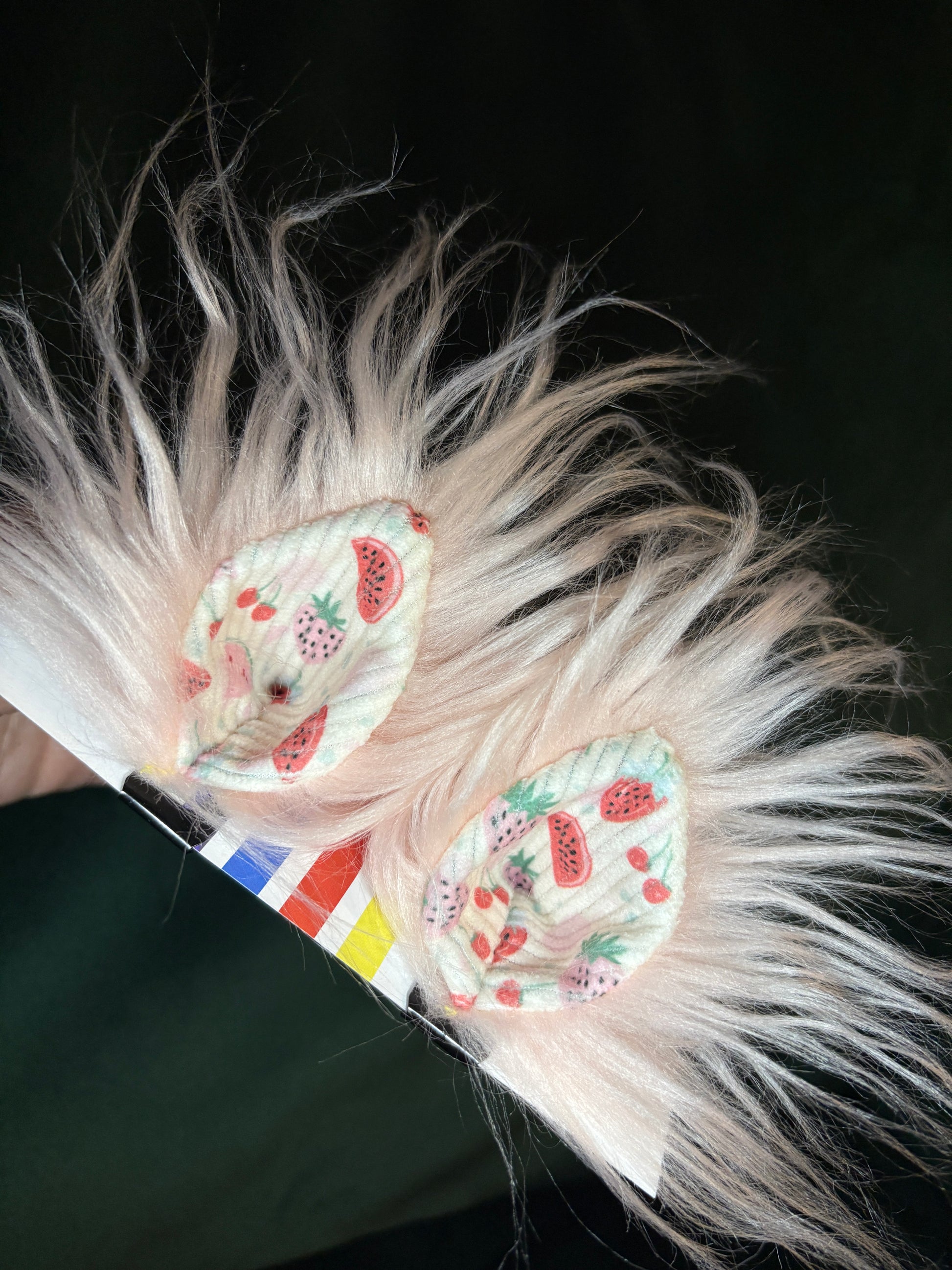 Hand-sewn with love and care, these ears feature long baby pink fur with a strawberry, cherry and watermelon corduroy interior. These blush babies give dreamy picnic and strawberry shortcake energy 🍓